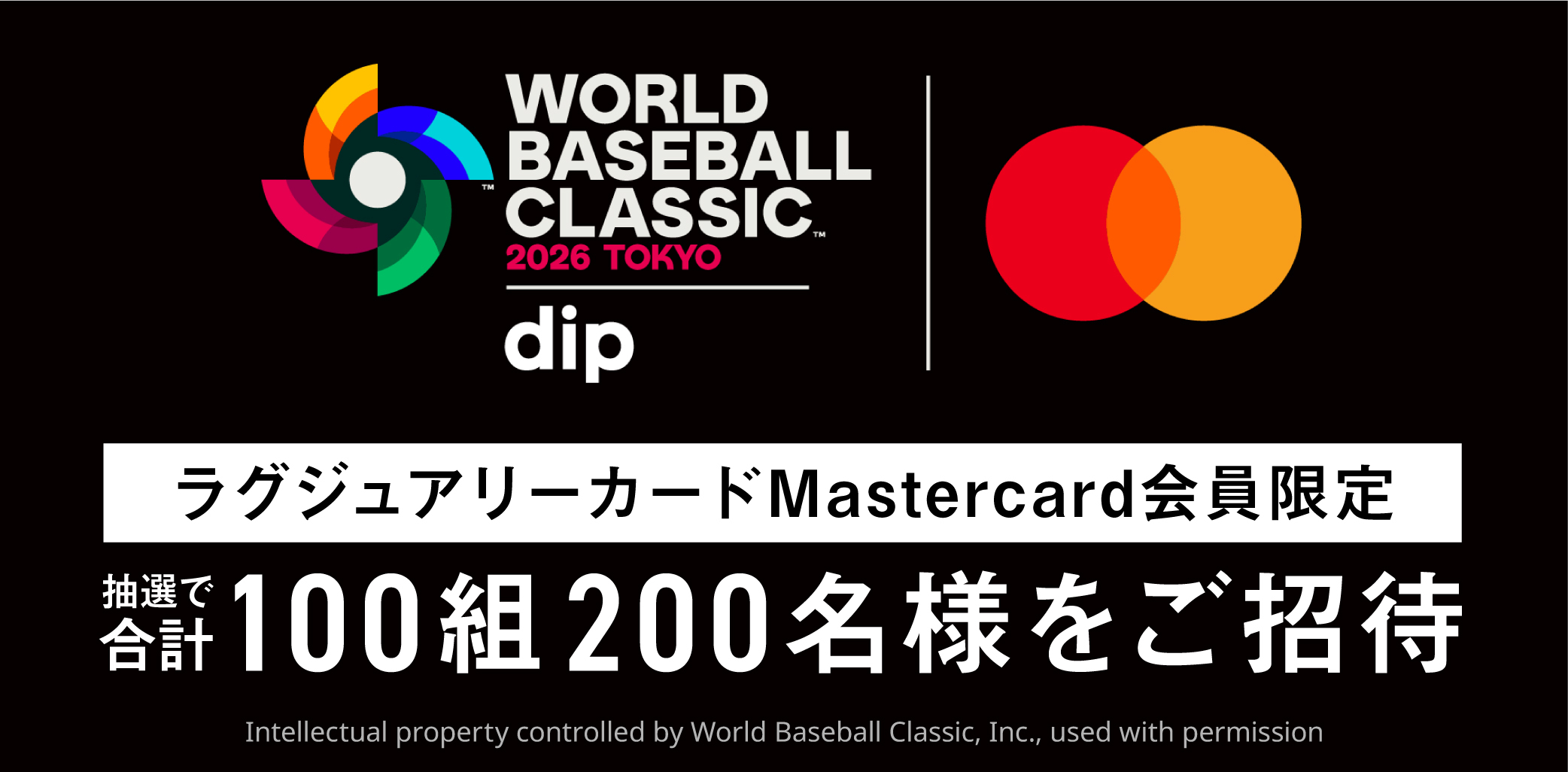キャンペーン期間中にエントリーのうえ、ラグジュアリーカードでカードショッピングを合計10万円(税込)以上ご利用いただくと、抽選で「2026 World baseball classic™ 東京プール presented by ディップ」の観戦チケット(ペア)を合計100組200名様にプレゼント!