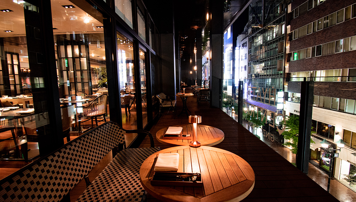 開放的な空間が広がる吹き抜けの下には、銀座並木通りを眼下に望むテラス席や、プライベートな空間で楽しめる個室も完備。活気あふれるショーキッチンの様子を眺めながらお食事を楽しめるダイニングエリアもご用意しています。