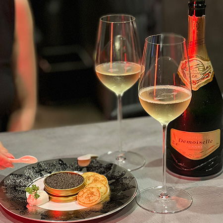 華やかなベルベットやレザー、滑らかな石や硝子が上品に施されたモダンでありながらも時代を超越した美しさを演出しているワインサロン。オーナー兼ソムリエのラメ・ヴァンサンが厳選した小皿料理とワインのペアリングをご提供。最高級カスピ海産ベルーガ・キャビアもご堪能いただけます。ご友人との楽しいひとときの演出や、大切な方々のおもてなしに最適のサロンです。
