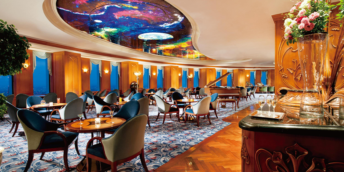 上品なヨーロピアン・エレガンスをコンセプトに統一された店内。はるかな都市の眺めを眼下に時間が経つのも忘れさせる洗練されたひとときをご提供します。