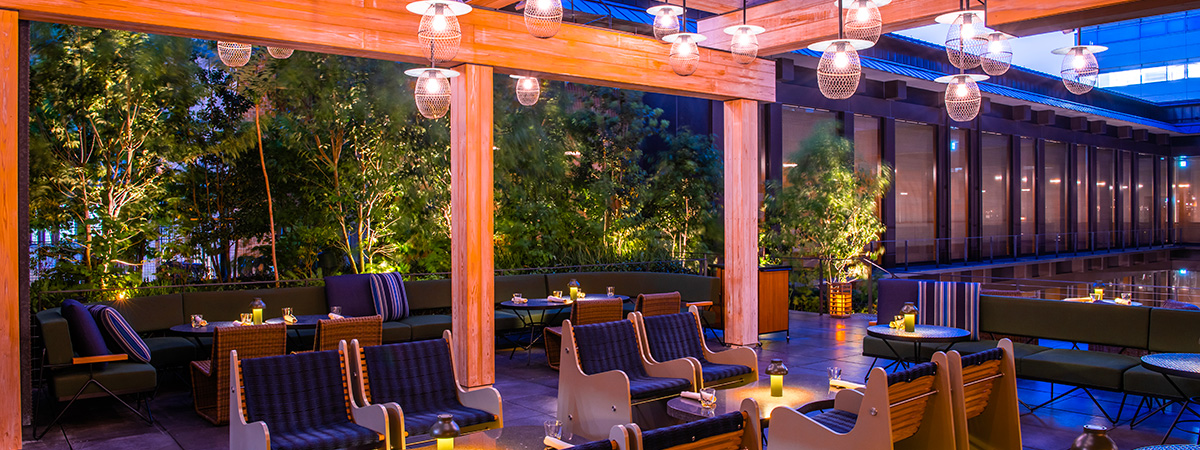 オリジナル・カクテル、窯焼きピザ。流れる音楽、そして笑い声。「開放感」をたっぷり味わえる、エースホテル京都3階にある自慢のルーフトップバーです。夏には日差しを浴びながら、冬には電気毛布でぬくぬくと。大型のソファからバーカウンターまで、新風館の中庭を一望する景色は風情も換気も良く安心。ワイングラスに注がれる柔らかな太陽の光と、さわやかな風をお楽しみください。