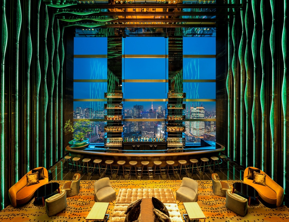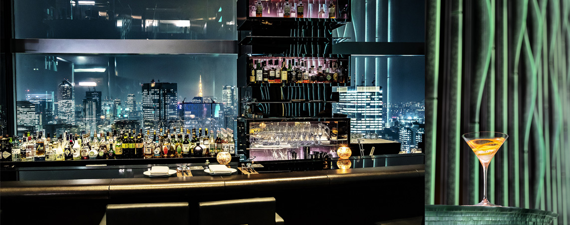 「滝」をイメージしたガラスアートに囲まれた、“浮遊感”漂う2フロア吹き抜けのカクテルラウンジ・バー。 圧倒的スケール感のガラス窓からは、刻一刻と姿を変える都心の景色を万華鏡のようにお楽しみいただけます。