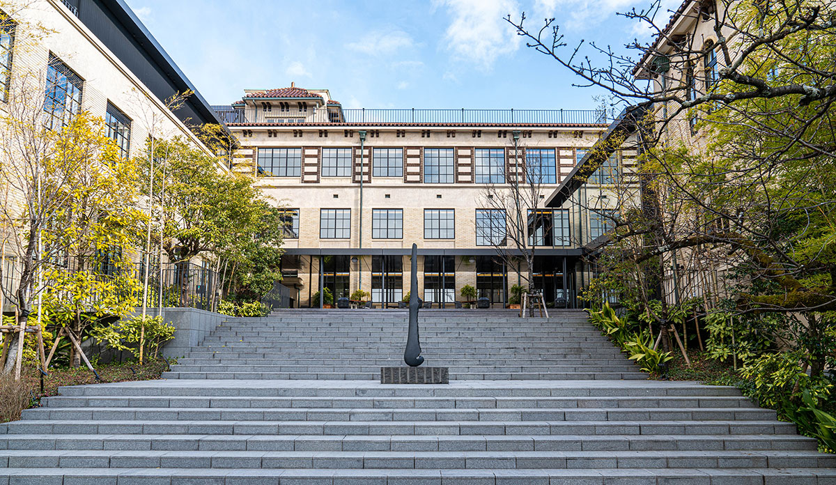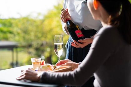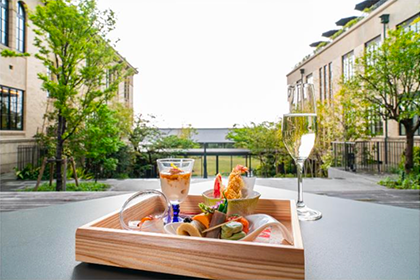 中庭から京都唯一の絶景を眺めながら楽しめる「ザ・ホテル青龍 京都清水」。校舎以外の人工的な建造物が視界に入りづらい元小学校の中庭のテラスからは愛宕山と沈む夕日だけが美しい景色に心を浸すことができます。ラグジュアリーホテルならではのオープンエアーなコートヤードテラスで、通常は宿泊者のみにご提供している特別なひとときをお楽しみください。